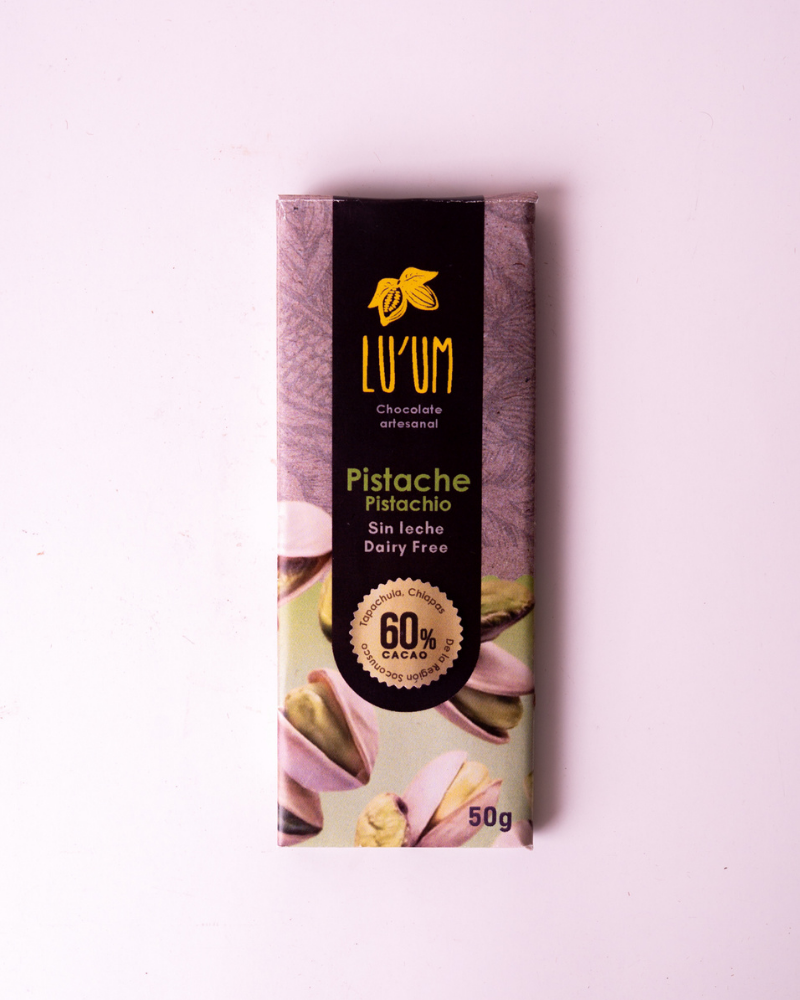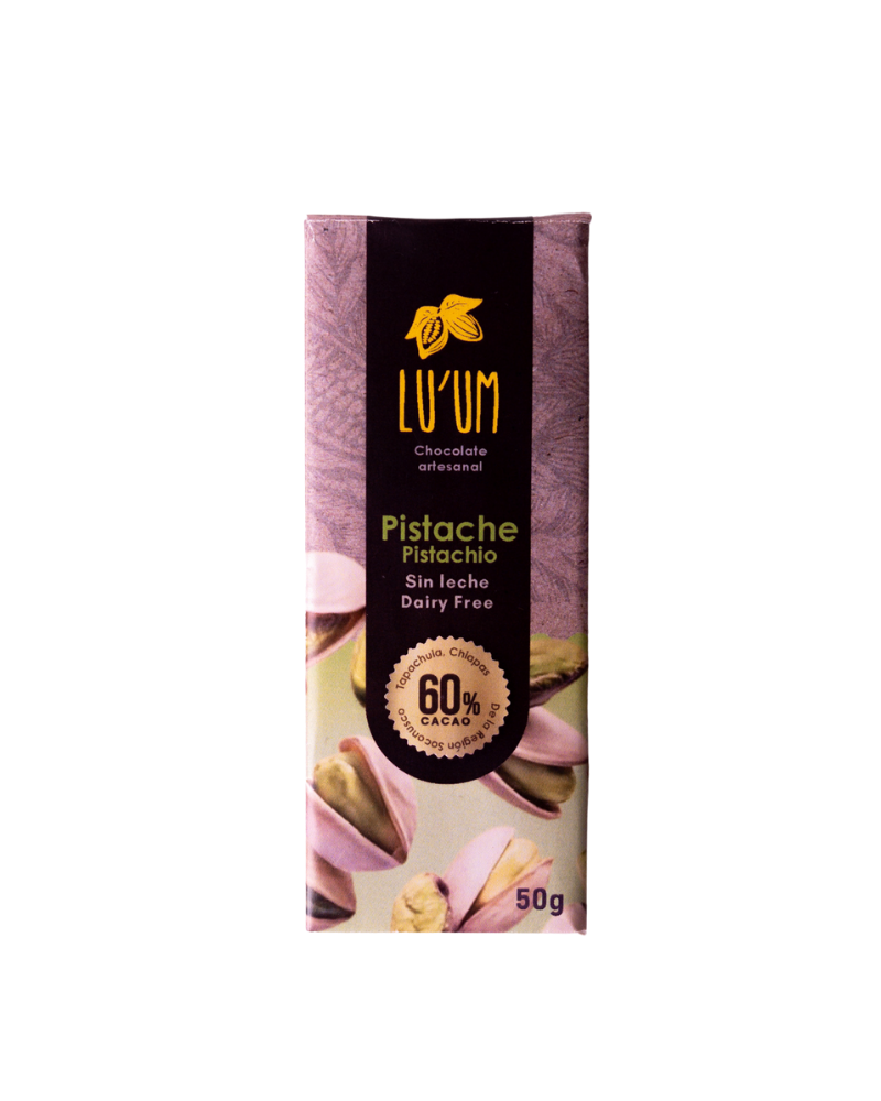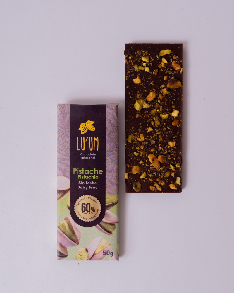 Molienda artesanal con maquinaria exclusiva para cacao. Los pistaches salados se incorporan durante el moldeado. Libre de contaminación cruzada y seguro para personas con alergias comunes.